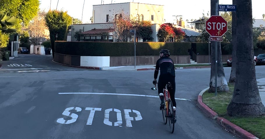 As cyclists, we’ve all been here. There’s a stop sign ahead so we approach scanning for traffic left, right, and straight ahead. Rolling toward the sign, we conclude there’s no danger, so we maintain our momentum and pass through the intersection.